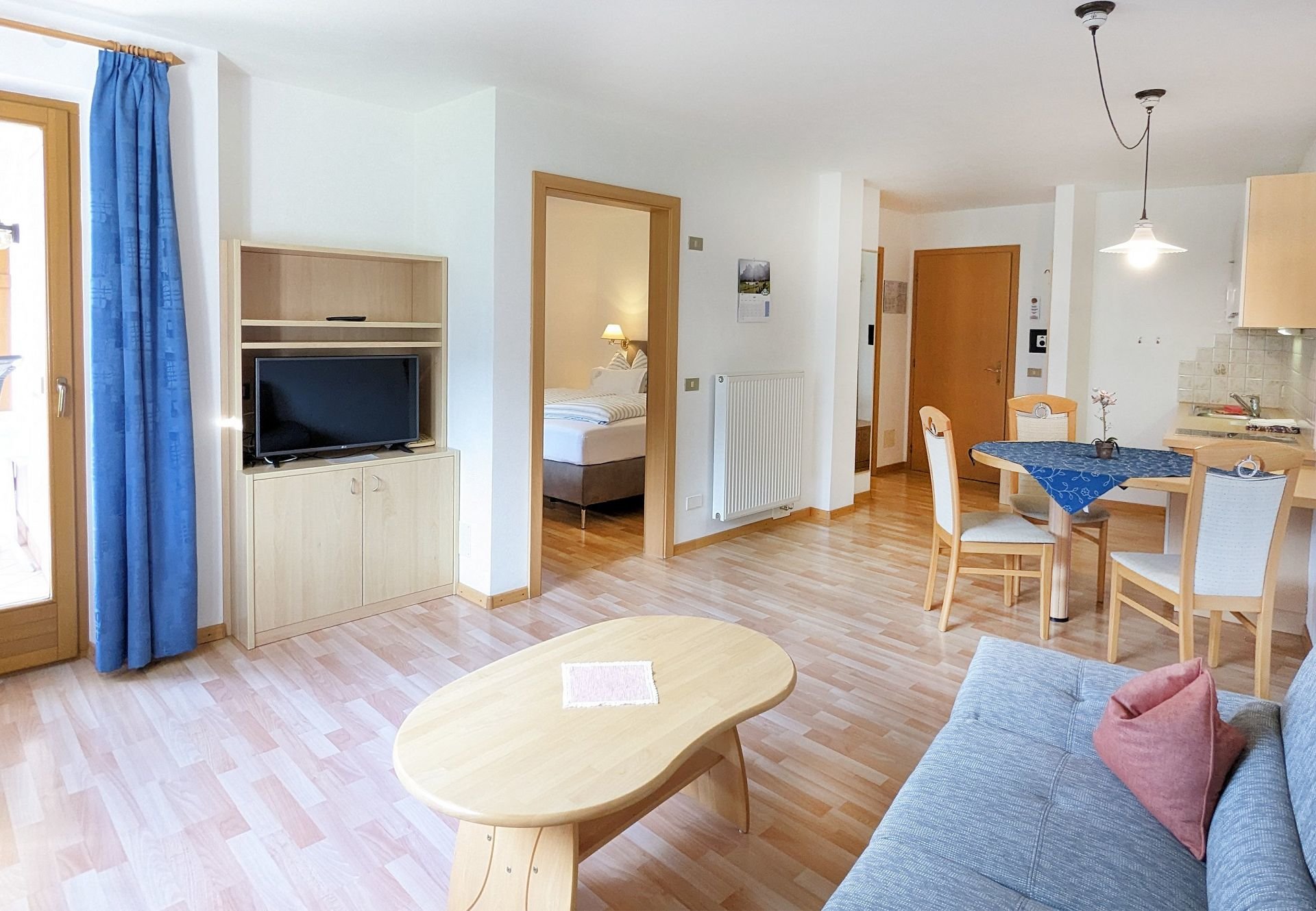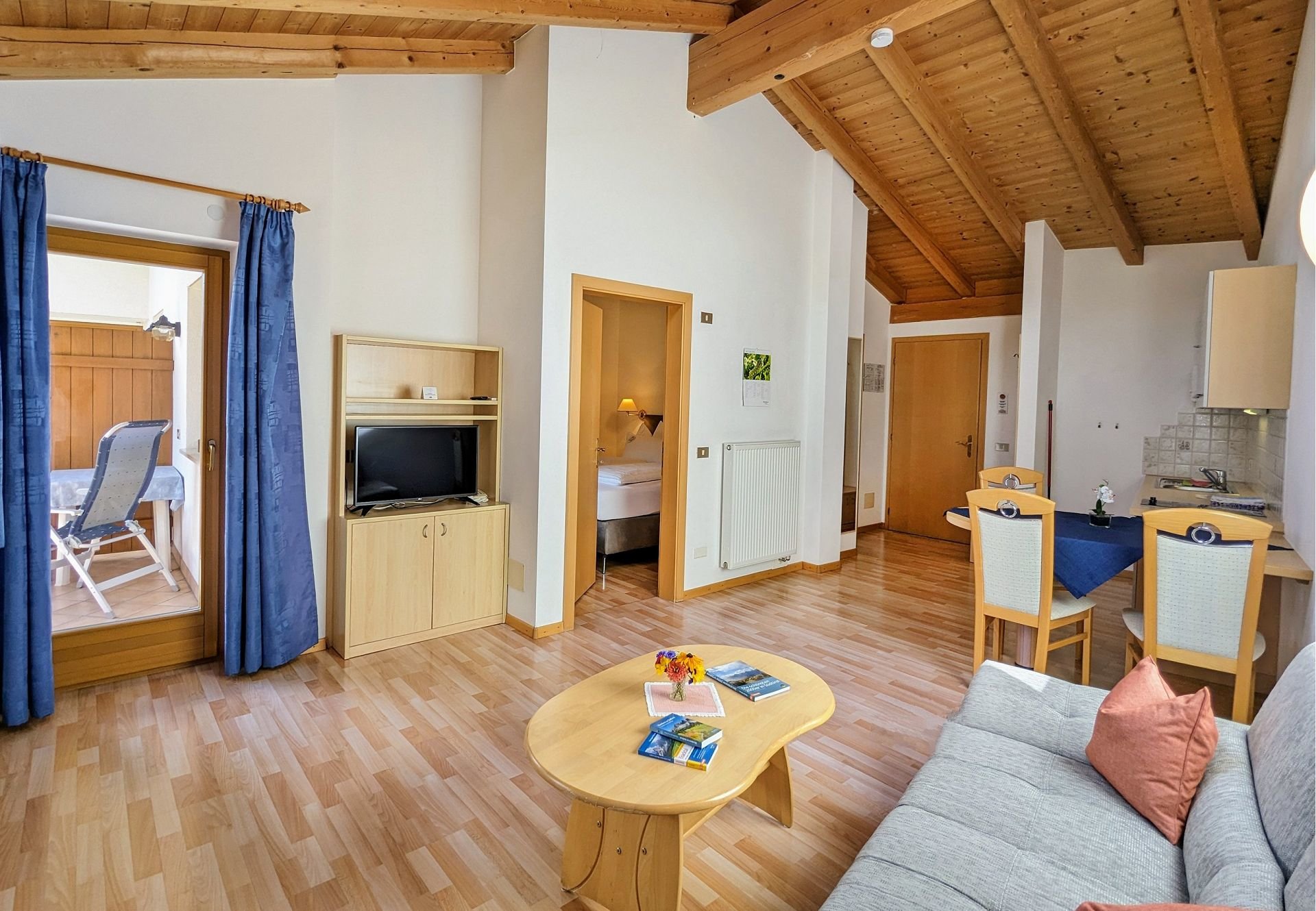 Ausstattung: Doppelzimmer, Dusche/WC, Wohnraum, Balkon, Küchenzeile (Kochnische mit Elektroherd, Kühlschrank, Kochgeschirr, Kaffeemaschine), TV mit Satellitenempfang, W-LAN Internetzugang; Bettwäsche, Hand- und Geschirrtücher sind vorhanden.